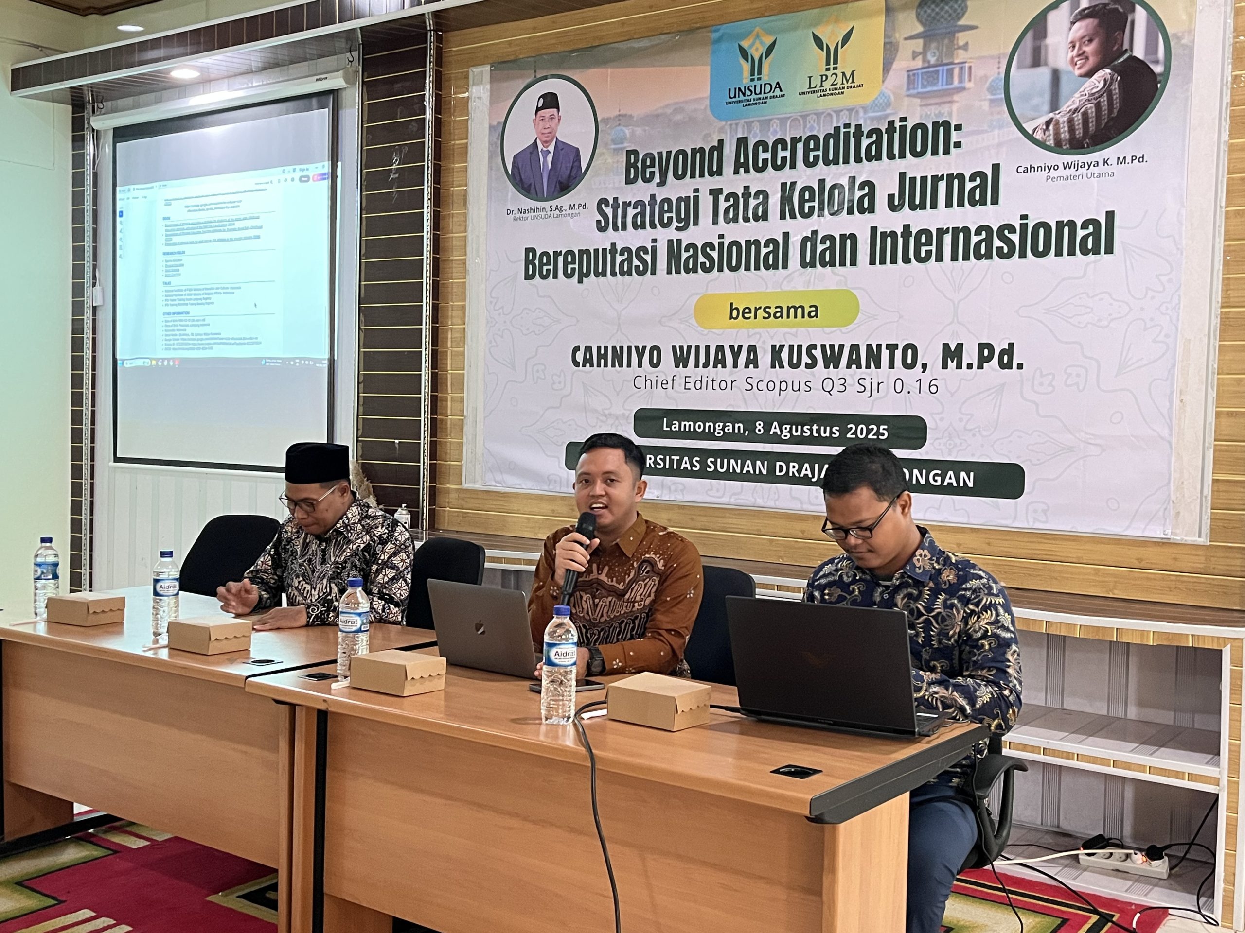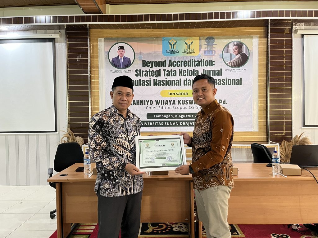 Berprinsip pada kualitas atau mutu Jurnal yang baik secara Nasional maupun Internasional, UNSUDA Lamongan mengadakan agenda peningkatan kapasitas pengelolaan Jurnal bereputasi dengan mengusung tema ” BEYOND ACCREDITATION : STRATEGI TATA KELOLA JURNAL BEREPUTASI NASIONAL DAN INTERNASIONAL “. Kegiatan tersebut diadakan pada Jum’at, 8 Agustus 2025.